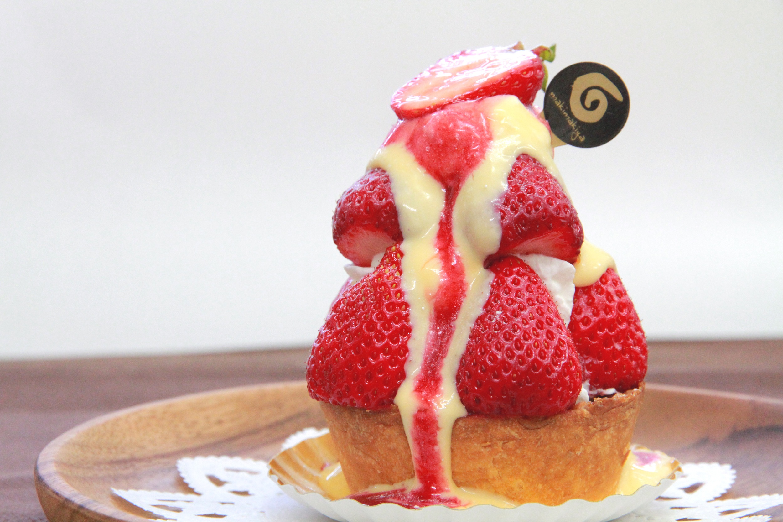 生クリームとイチゴを一緒に巻いて、その上にマキ・マキ自慢のプリンがのっています。